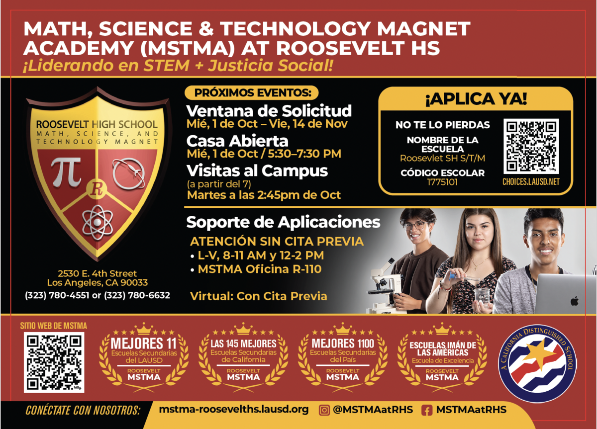 ¡La Academia Magnet MSTMA en Roosevelt High School invita a todas las familias con estudiantes de 8vo grado (Clase de 2030) a nuestra Casa Abierta el mismo día que abre la ventana de solicitud de Choices para el año escolar 2026–2027!